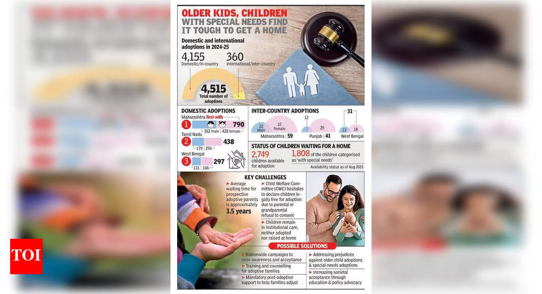पुणे: महाराष्ट्राने गेल्या फिनिशियल वर्षात 84 84 ent इंटरकंट्री आणि घरगुती दत्तक घेऊन देशातील ध्रुव स्थिती जिंकली – राज्याच्या मागील आर्थिक वर्षातील 52२२ च्या तुलनेत% 38% वाढ.संपूर्ण भारतामध्ये ,, 5१15 मुलांना कुटुंबे सापडली – एका दशकात सर्वाधिक दत्तक मोजणी. तरीही, सेंट्रल अॅडॉप्शन रिसोर्स अथॉरिटी (सीएआरए) आकडेवारीनुसार, सध्या कायदेशीररित्या उपलब्ध असलेल्या केवळ २,749 children मुलांपैकी एक दत्तक घेण्याच्या आशेने, सध्या 36,000 पेक्षा जास्त संभाव्य दत्तक पालक (पीएपी) प्रतीक्षा यादीमध्ये आहेत. यापैकी 1,808 विशेष-गरजा मुले म्हणून वर्गीकृत आहेत.बहुतेक पॅप्स मुलगी मुले आणि 0-2 वर्षे वयोगटातील, मोठी मुले आणि विशेष गरजा असलेल्या लोकांना कमी ठेवतात. २०२24-२5 आर्थिक वर्षात (एफवाय) दत्तक घेतलेली तब्बल २,5554 मुले मुली होती, ही भारतातील सर्व दत्तकांपैकी% 56% आहे.“मुलांपेक्षा मुलींना दत्तक घेण्यास उपलब्ध करुन देण्याचे एक कारण म्हणजे त्यांना दत्तक घेण्यासाठी उपलब्ध करुन देण्यात आले आहे,” पूर्वी कारा यांच्याकडे संस्थापक सदस्य आणि आंतर-देशातील दत्तक अनुप्रयोगांच्या स्क्रीनिंगसाठी “एनओसी” समितीचे सदस्य म्हणून सांगितले.पुणे येथील ज्येष्ठ महिला आणि बाल विकास विभागाच्या अधिका said ्याने सांगितले की, “काही पालकांचा असा विश्वास आहे की मुली अधिक काळजी घेणारी आणि प्रेमळ असतात आणि वृद्ध वयात त्यांच्या पालकांची काळजी घेण्याची शक्यता जास्त असते. काही मुलींना कौटुंबिक जीवनाशी अधिक सहजतेने जुळवून घेतात. सामाजिक जागरूकता आणि अविवाहित स्त्रिया बर्याचदा मुलींना दत्तक घेण्यास प्राधान्य देतात.”बर्याच पॅप्सचा असा विश्वास आहे की अर्भक आणि लहान मुलांशी भावनिक संबंध निर्माण करणे सोपे आहे. अधिका said ्याने म्हटले आहे की, “काहींसाठी, लहान मुलांचा अवलंब केल्याने त्यांची मूल्ये, व्यक्तिमत्त्व आणि संगोपन आकार देण्यास अधिक वाव मिळते. इतरांना संपूर्ण पालकत्वाचा प्रवास – बालपणापासून तारुण्यातून अनुभवण्याची इच्छा आहे.”मोठ्या मुलांसाठी, दत्तक घेणे अवघड होते. पुणे येथील कारा येथे नोंदणीकृत अरुण आश्रे चॅरिटेबल ट्रस्टचे सामाजिक कार्यकर्ते जयप्रकाश जाधव यांनी सांगितले की, “सात वर्षांपेक्षा जास्त वयाची मुले कायदेशीररित्या मुक्त आणि प्रतीक्षा करीत आहेत.”महिला आणि बाल विकास विभागाच्या अधिका said ्याने सांगितले की, “मोठी मुले आणि विशेष गरजा असणा those ्यांना संलग्नक समस्या, वर्तनविषयक चिंता किंवा काही वैद्यकीय आवश्यकता यासारख्या आव्हानांचा समावेश असू शकतो. काही पीएपी जुन्या किंवा विशेष-गरजा मुलांच्या गरजा, संभाव्यता आणि क्षमता पूर्णपणे समजू शकत नाहीत. आवश्यक काळजी आणि समर्थन प्रदान करण्यासाठी त्यांना अप्रिय –
