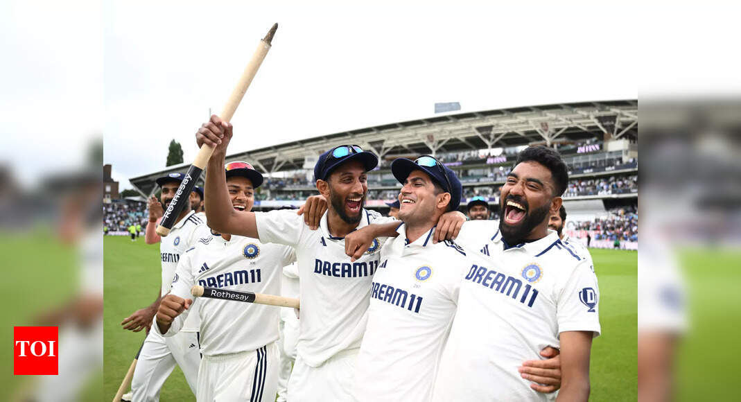 सामना जिंकल्यानंतर टीम इंडिया साजरा करतो (गॅरेथ कोपेली/गेट्टी इमेजेसचा फोटो) जेव्हा मोहम्मद सिराजने गस k टकिन्सनच्या स्टंपवर रॅटल यॉर्करला गोलंदाजी केली आणि ओव्हल कसोटी सामन्यात